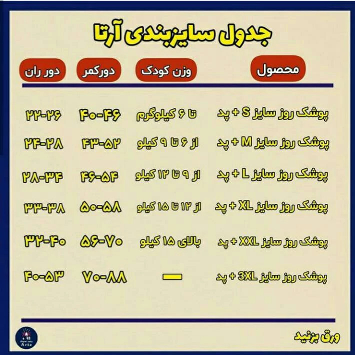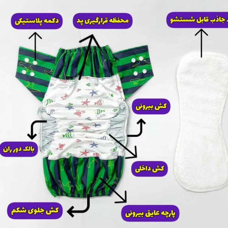 پوشک شب آرتا جایگزین کامل پوشکهای یکبار مصرف تشکیل شده از سه لایه ضدآب و مشما و پارچه نخی .✅ قابلیت نگهداری تایم زیاد از 6 ساعت تا ده ساعت بدون نمدهی.✅ دارای قابلیت سایزبندی کمر وفاق همراه یک پد چندلایه حوله ای🔻 ❗پوشک های یکبار مصرف دارای پودر جاذب هستن که بسیار سمی و مضرن، پس مامان عزیز با استفاده از محصولات ارگانیک آرتا پلاس سلامتی کودکت رو تضمین کن😍👌 توجه داشته باشید داخل هر پوشک یک عدد پد وجود دارد